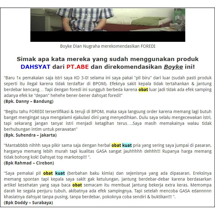 “Baru 1x pemakaian saja istri saya KO 3-0! selama ini saya pakai “pil biru” dari luar (sudah pasti produk seperti itu ilegal karena tidak terdaftar di BPOM). Efeknya sakit kepala tidak tertahankan & jantung berdebar kencang… Tapi dengan foredi ini sungguh berbeda karena obat luar jadi tidak ada efek samping adanya efek ke “depan” hehehe bener-bener dahsyat foredi!”